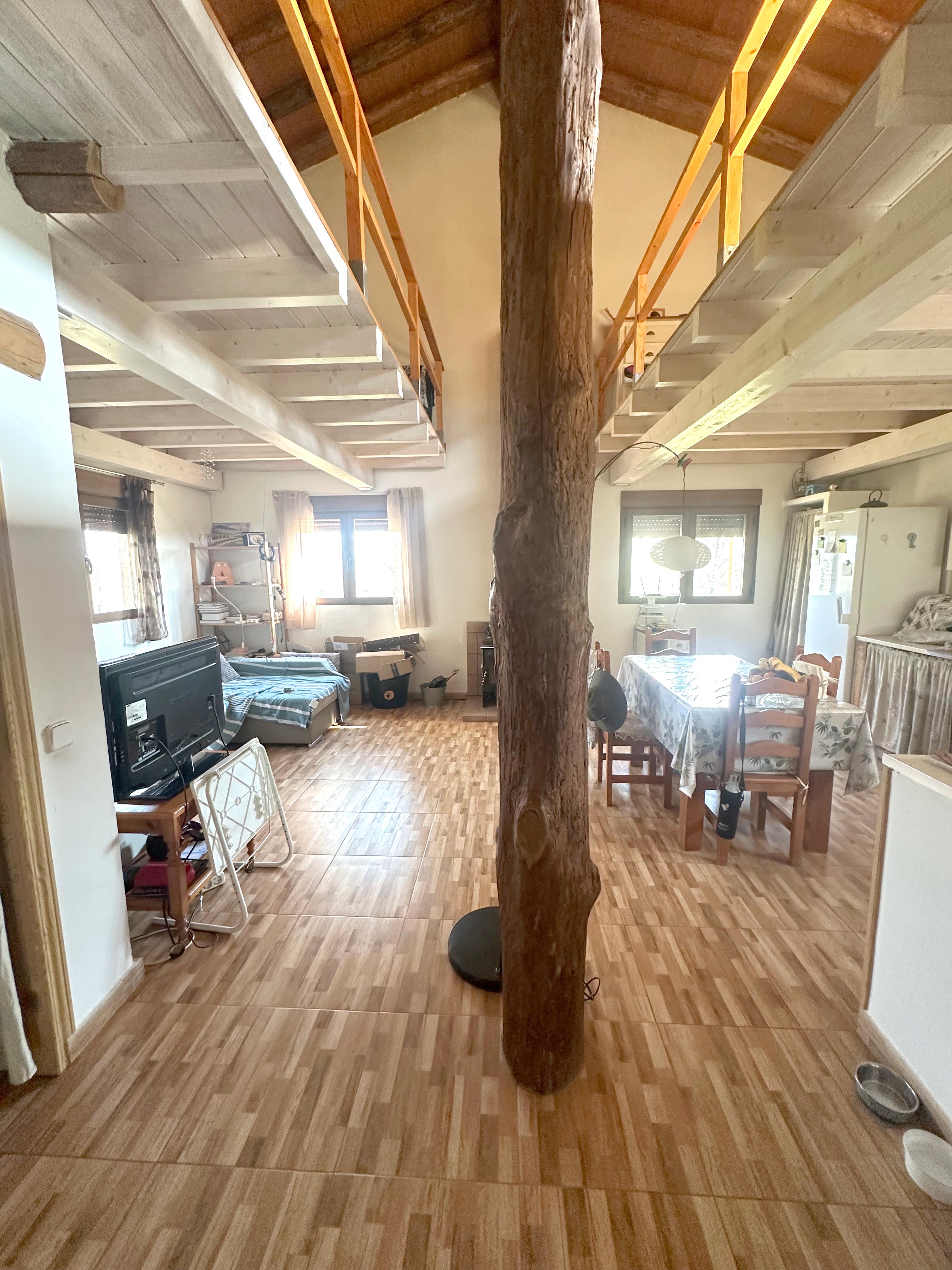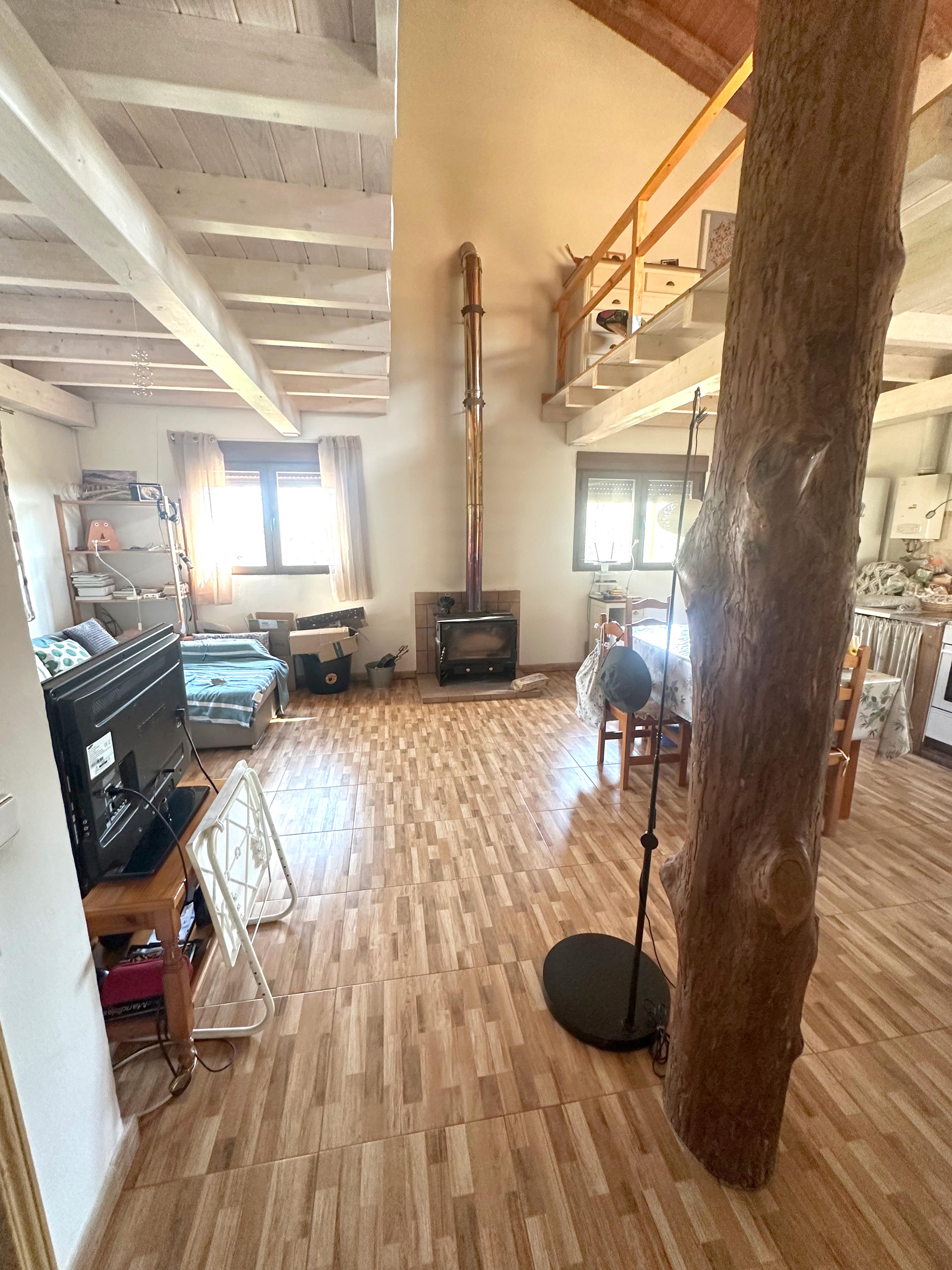 En la planta baja dispone de dos habitaciones, un baño completo, despensa y un bonito espacio diáfano de salón-cocina, presidido por una acogedora chimenea que se convierte en el corazón de la casa . La distribución está pensada para resultar práctica, cómoda y a la vez muy agradable para el día a día.